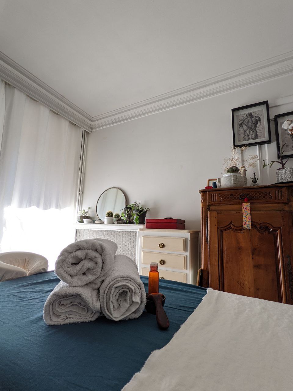 Installée à Asnières-sur-seine, je vous reçois sur rendez-vous, dans mon cabinet. Ma formation a commencé par le massage énergétique chinois (Chi Nei Tsang) auprès de l'école du Centre Tao ou j'ai appris à écouter le corps. J'ai ensuite souhaité approfondir mes connaissances anatomique et physiologique et me suis formée en technique d'ostéopathie auprès de l'école Jaidee. En 2020, à l'occasion de ma formation en TNC (Technique Neuro-Cutanée) j'ai appréhendé un autre toucher, plus intuitif et précis.